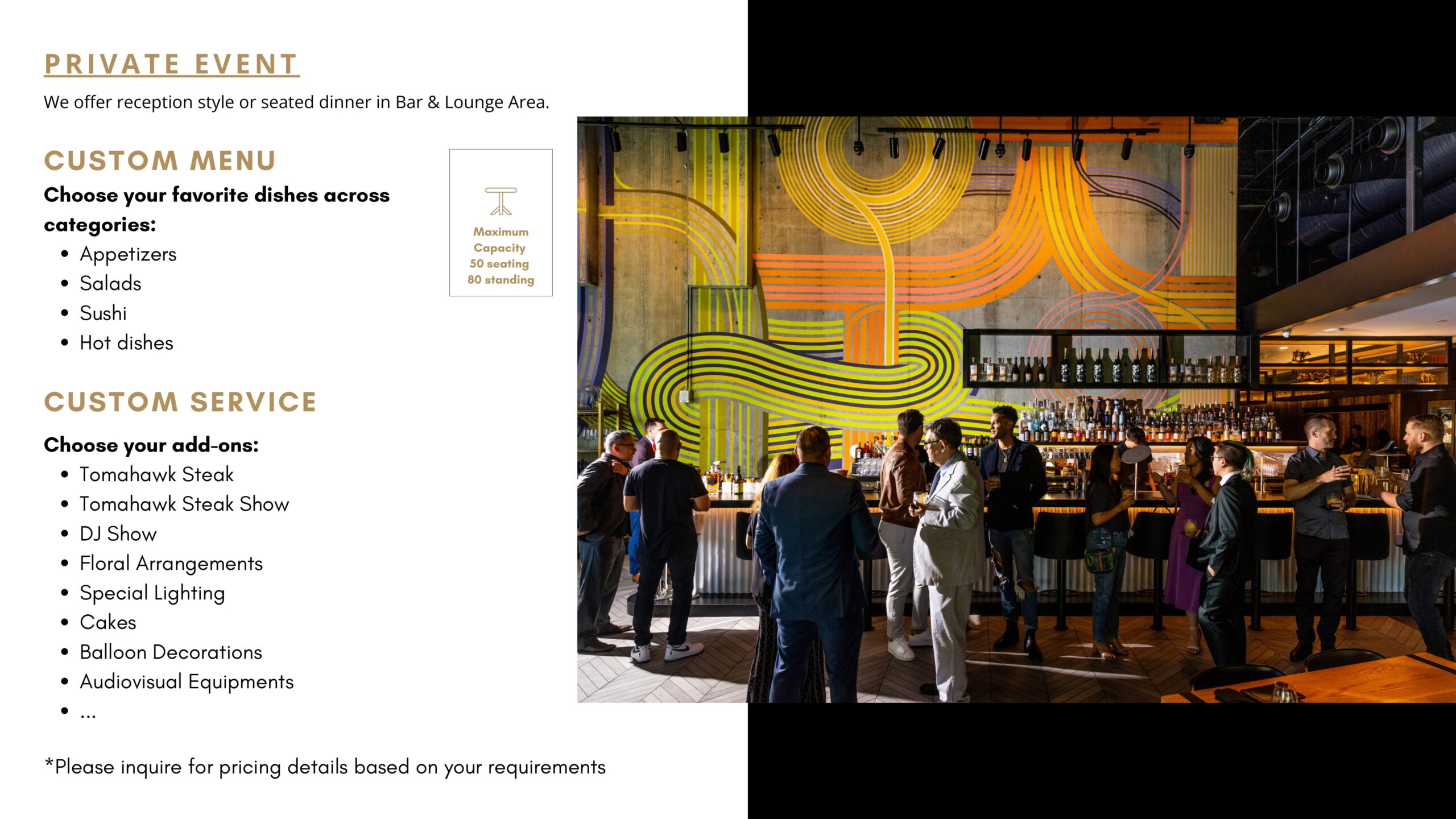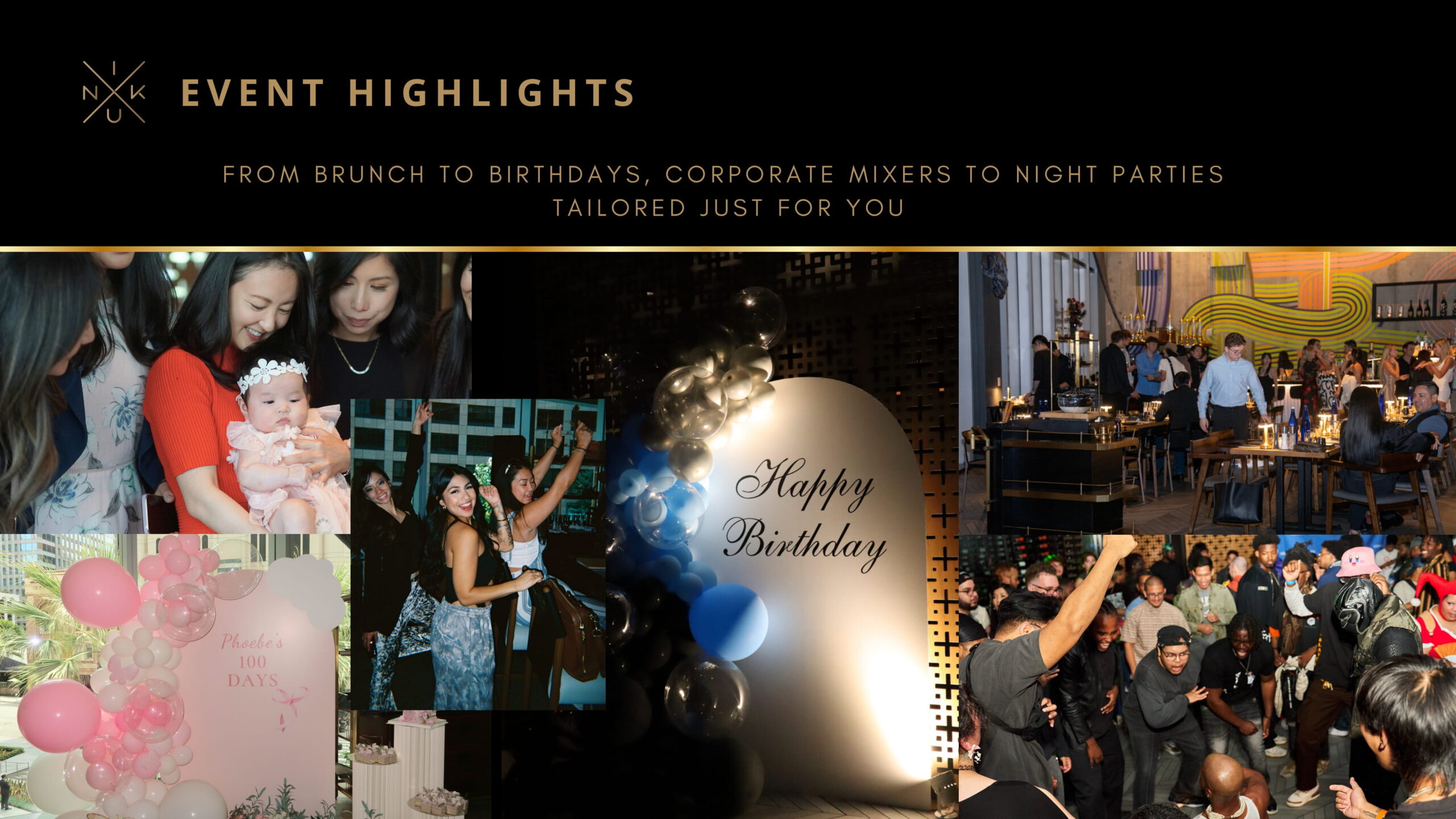 At NIKU X, we craft tailored experiences for every occasion. Celebrate birthdays and anniversaries. Impress clients at corporate gatherings. Transform the entire space with a full buyout. Our modern setting, premium cuisine, and attentive service make your event unforgettable.